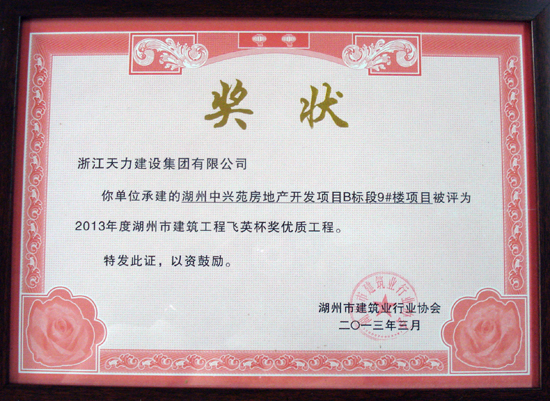 湖州中興苑房地產(chǎn)開(kāi)發(fā)項(xiàng)目B標(biāo)段9#樓項(xiàng)目被評(píng)為2013年度飛英杯