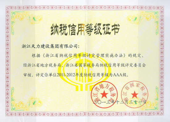 2011-2012年度納稅信用等級AAA級