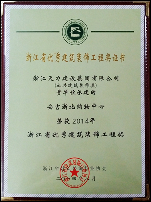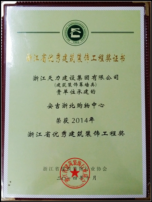 安吉浙北購物中心(建筑裝飾幕墻類)、(公共建筑裝飾類)榮獲2014年浙江省優(yōu)秀建筑裝飾工程獎