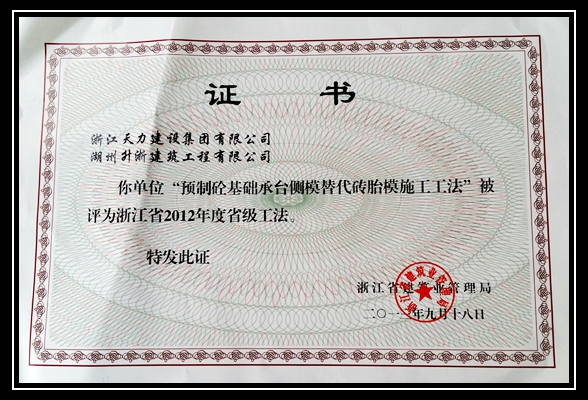 “預制砼基礎承臺側模替代磚胎膜施工工法”榮獲2012年度省級工法