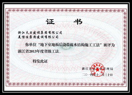 “地下室地板后澆帶疏水結構施工工法”榮獲2013年度省級工法