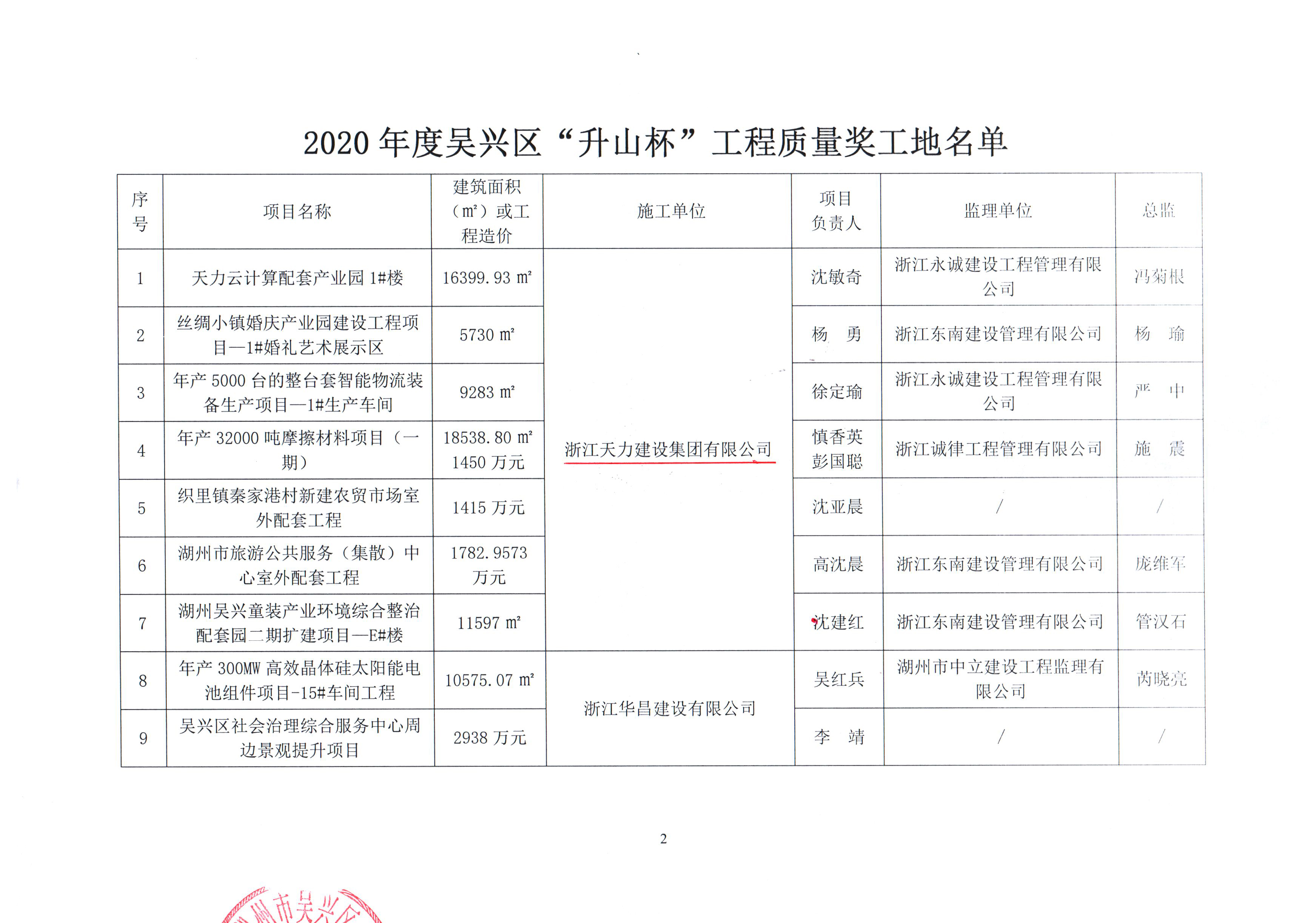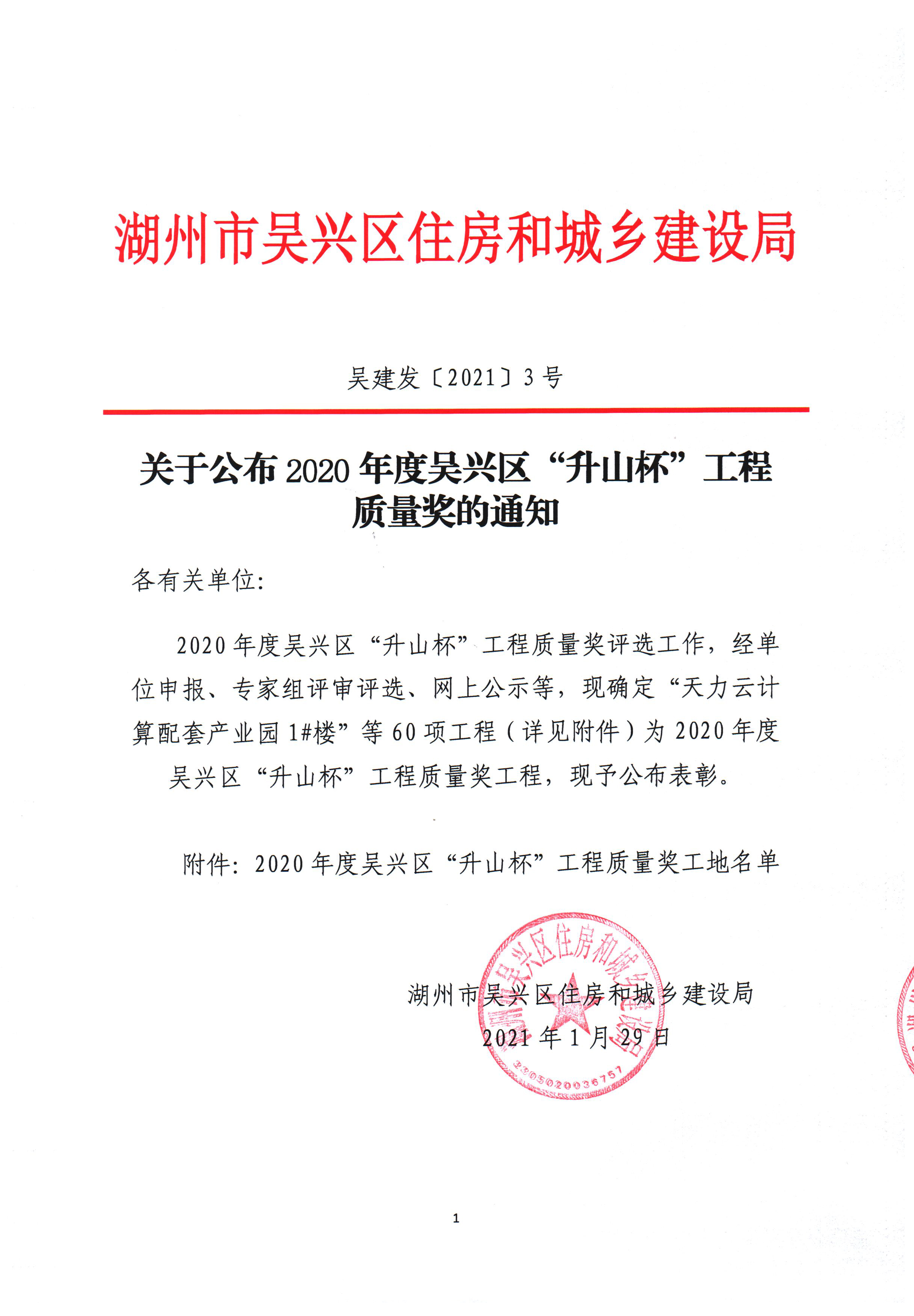 2020年度吳興區“升山杯”工程質量獎