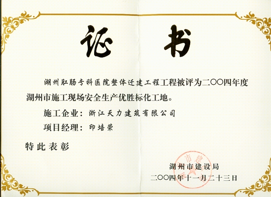 湖州肛腸專科醫院整體遷建2004年度湖州市優勝標化
