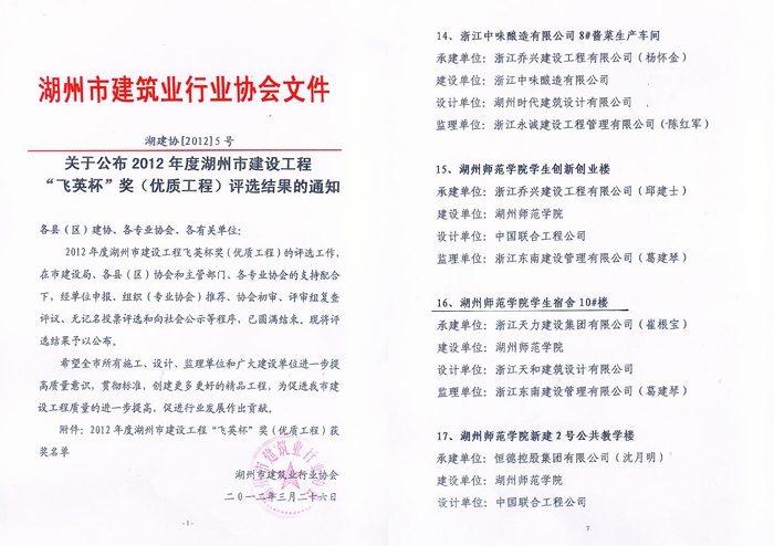 湖州師范學(xué)院學(xué)生宿舍10#樓工程榮獲2012年度湖州市“飛英杯”