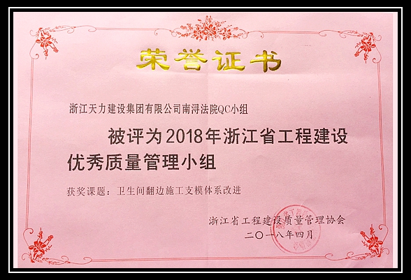 我公司南潯區人民法院新建審判用房QC小組被評為“2018年浙江省工程建設優秀質量管理小組”,獲獎課題為《衛生間翻邊施工支模體系改進》。