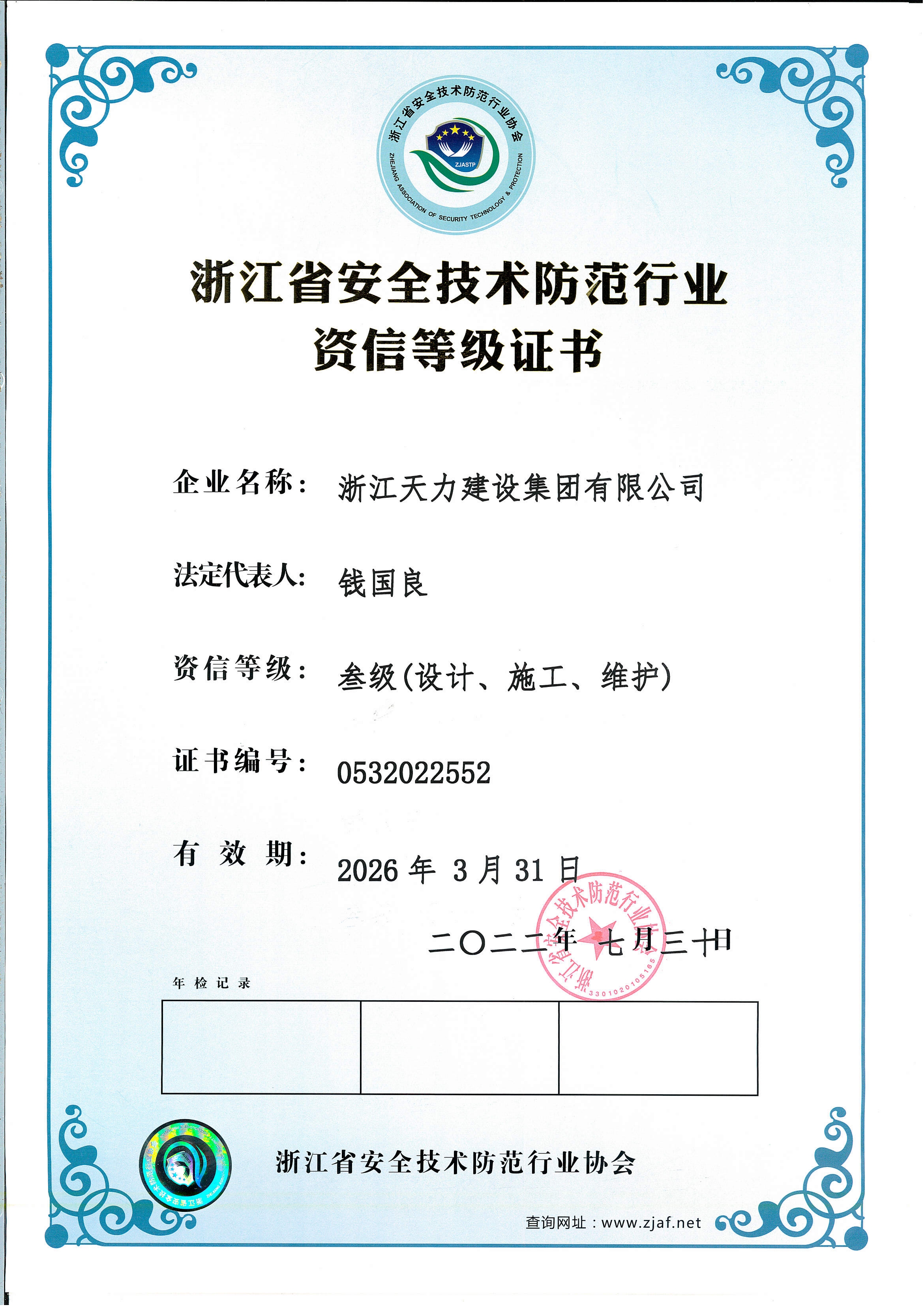 天力集團(tuán)榮獲浙江省安全技術(shù)防范行業(yè)資信叁級(jí)證書(shū)